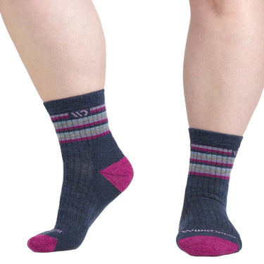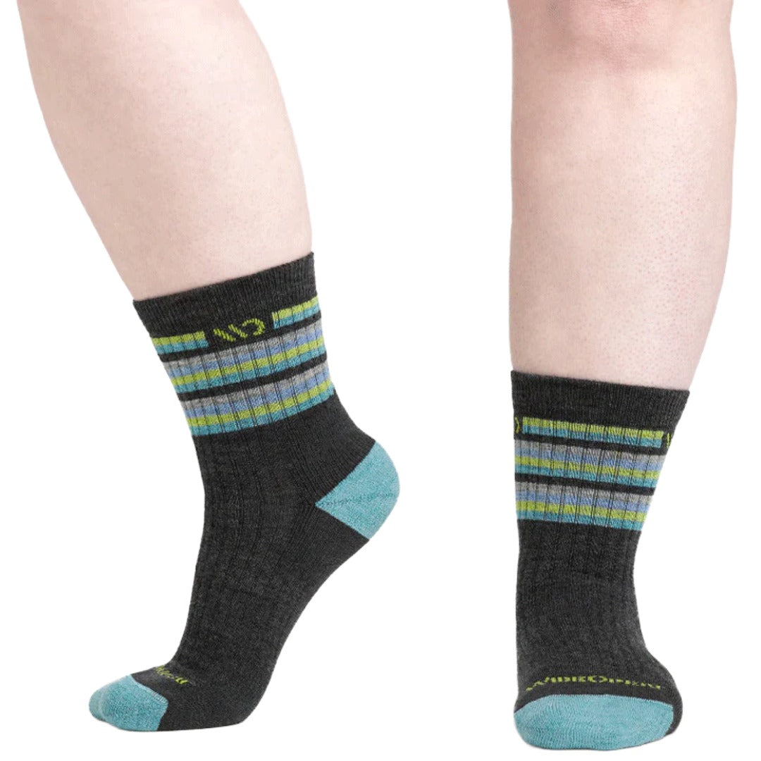 A Fall mood wraps this sock in autumnal stripes. Made of midweight, terry loop Merino Wool for multi - season activity (including lounging), the Women’s Multi Stripe Cushioned Micro Crews wraps the lower legs, peeking out just over to top of a boot or high top — no adjusting throughout the day required.