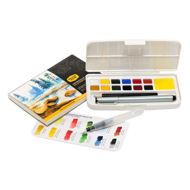 Set includes 12 watercolor paints, medium round refillable watercolor brush, drawing marker, pencil, color sampler, sponge, mixing pallets and paper pad.
