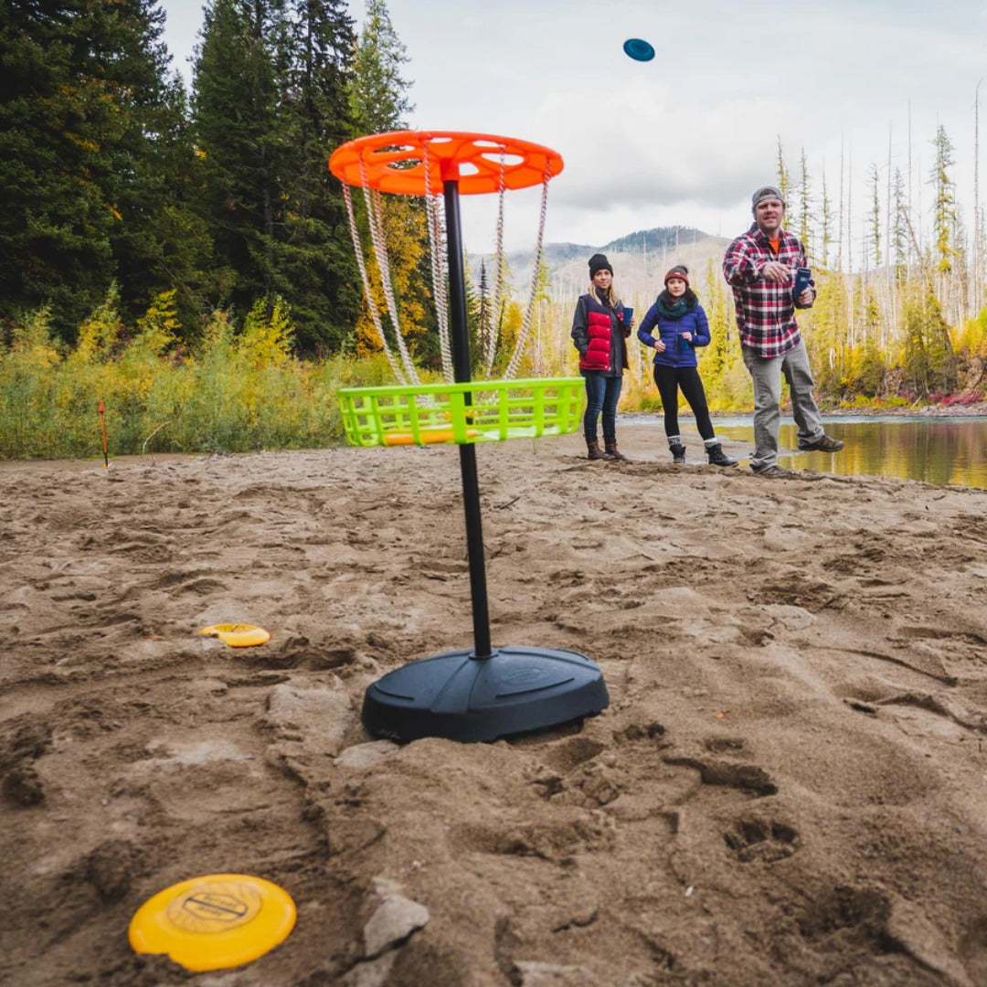 Play a fun game of mini disc golf with family or friends. This travel size game is a target shooting game or a par-3 round of golf. Can be played indoors or out! Quick set-up.