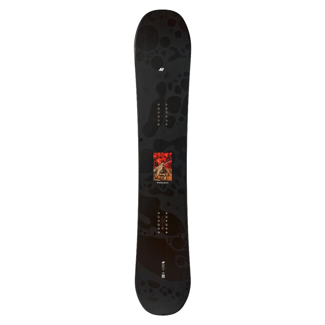 Backcountry kickers, side hits galore, fresh cord -- the K2 Embassy has your back for wherever you take it. Engineered with versatility in mind, this directional all-mountain snowboard has become an instant classic amongst our staff and team riders. The heart of the Embassy snowboard is the BAP Core, consisting of Bamboo, Aspen, and Paulownia - sustainably harvested to provide a smooth feel and snappy flex that’s built to stand the test of time. The Combination Camber Profile adds just a bit of rocker to the nose and tail for a predictable feel in deep snow and smooth butters.We sandwich the core with ICG™ 10 Biax Fiberglass with tip-to-tail carbon stringers for high-speed stability and edge hold through choppy terrain and a little bit of taper for a classic feel that gets you out of your turns with silky precision.